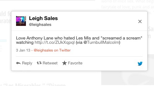 We hated Les Mis movie Posted on January 4, 2013 by goldcoastbooklovers And we’re not the only ones, another 20 years till the next musical if I live that long! Read the review here Share this:Tweet Click to email a link to a friend (Opens in new window) Email Like Loading... Related