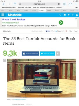 The 25 Best Tumblr Accounts for Book Nerds Posted on March 17, 2014 by goldcoastbooklovers Via Mashable – Posted using BlogPress from my iPad Share this:Tweet Click to email a link to a friend (Opens in new window) Email Like Loading... Related