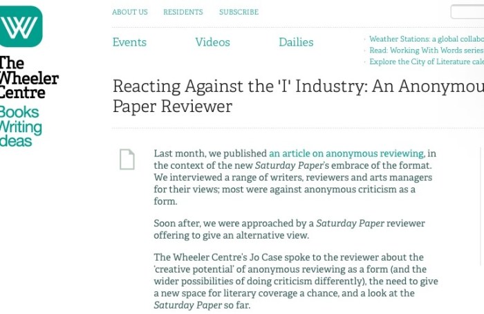 Anonymous Reviews Posted on April 10, 2014 by goldcoastbooklovers Via The Wheeler Centre Share this:Tweet Click to email a link to a friend (Opens in new window) Email Like Loading... Related