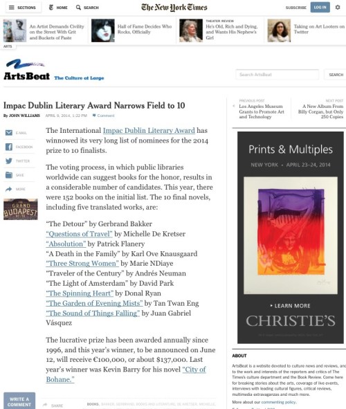 Impac Dublin Shortlist Announced Posted on April 11, 2014 by goldcoastbooklovers Karl Ove might win! Via NYT Share this:Tweet Click to email a link to a friend (Opens in new window) Email Like Loading... Related